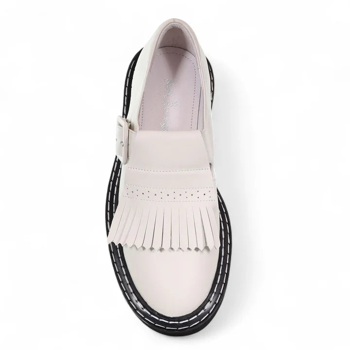 Step up your style with Cameo Fringe, a modern twist on the classic Mary Jane. Featuring a removable fringe detail, giving two showstopping looks in one. With a chunky cleated sole and double-stitched rand, this versatile is perfect for pairing with skirts, dresses, or cropped trousers, Cameo Fringe brings a bold, versatile edge to your everyday wardrobe.