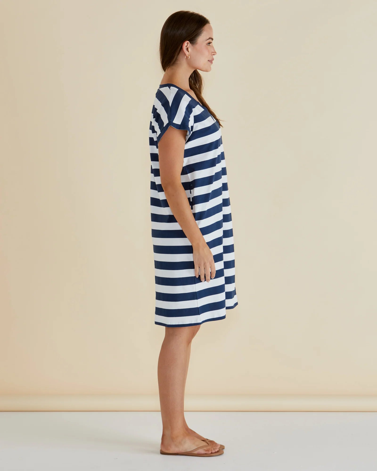 The Zena T-Shirt Dress is a relaxed, easy-to-wear piece featuring a V-neckline and grown-on sleeves with turn-back cuffs. Knee length and equipped with pockets, it offers an elevated yet comfortable silhouette. A classic, effortless transeasonal dress designed for versatile styling.