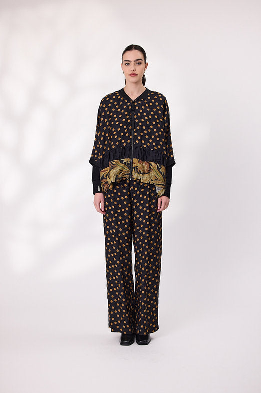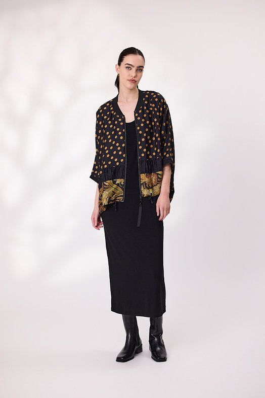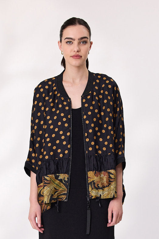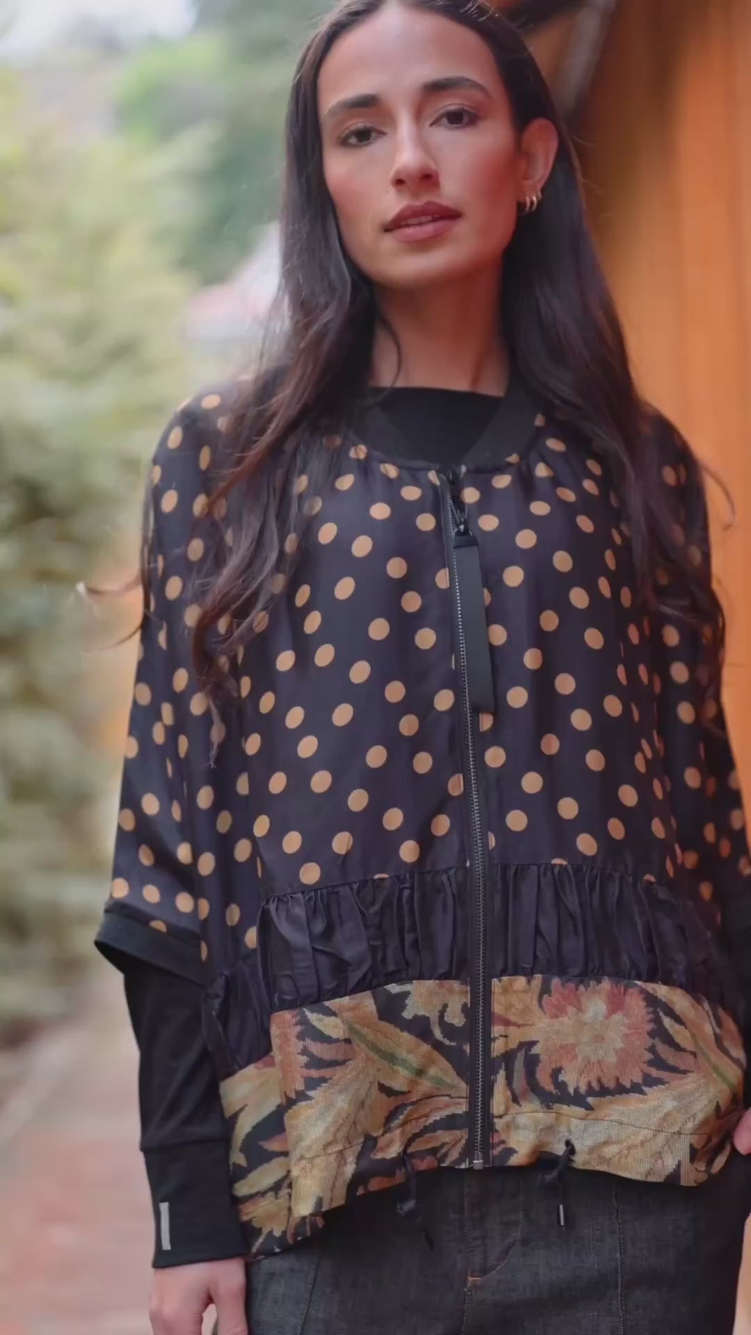 Elevate your wardrobe with this printed viscose jacket, blending bold design with everyday comfort. Featuring a black base adorned with gold polka dots and floral accents.The front zipper closure adds functionality while ribbed neckband and cuffs bring a sporty edge to the silhouette.