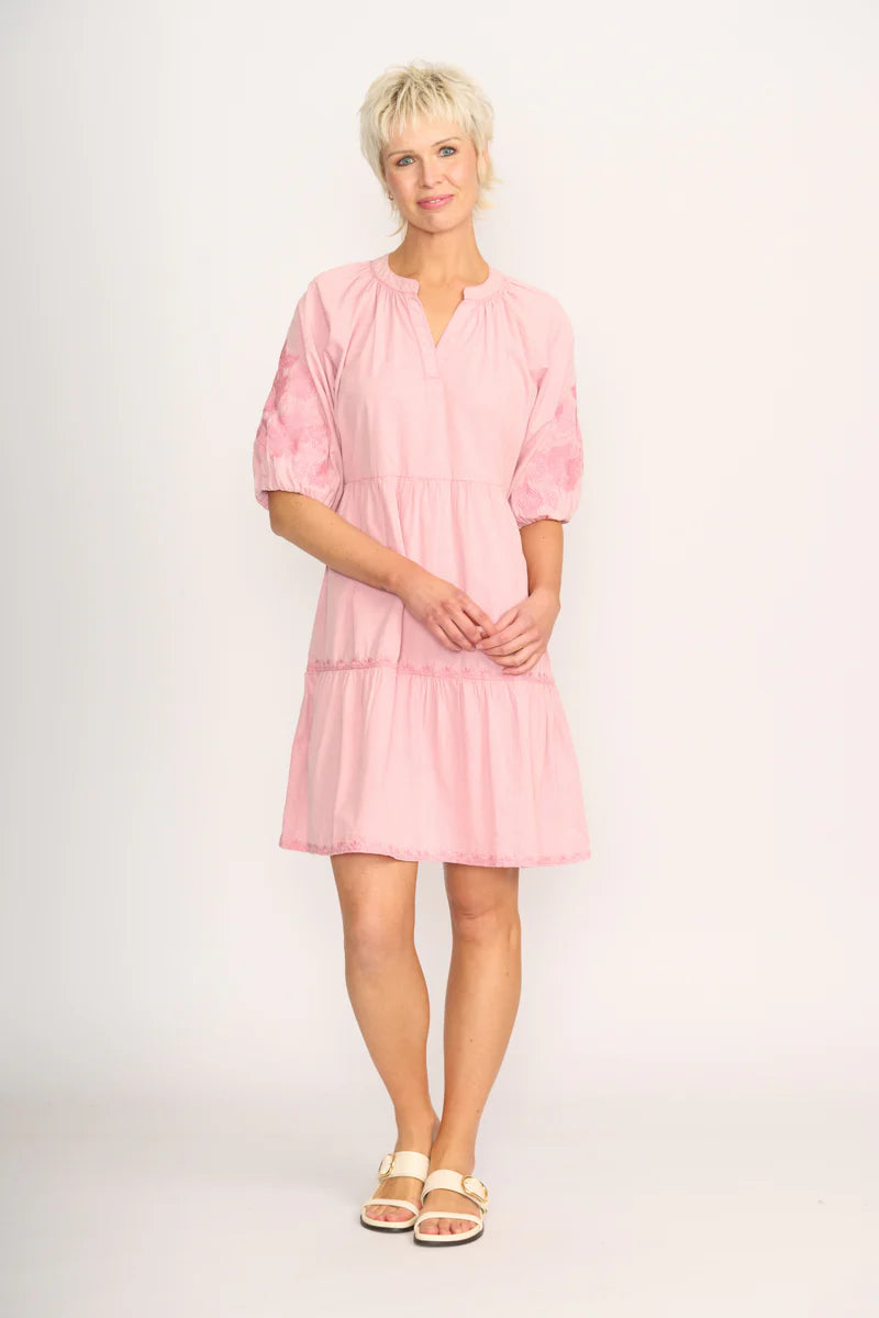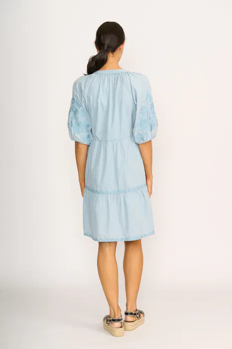 Softly tiered knee-length dress, garment-dyed for a beautifully lived-in finish. Featuring a flattering V neckline and set-in sleeves with gentle elasticated cuffs. Delicate embroidery highlights the collar, sleeves, and tiered panels, adding a touch of effortless elegance.