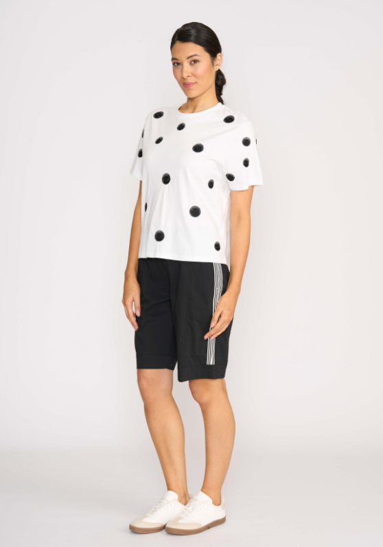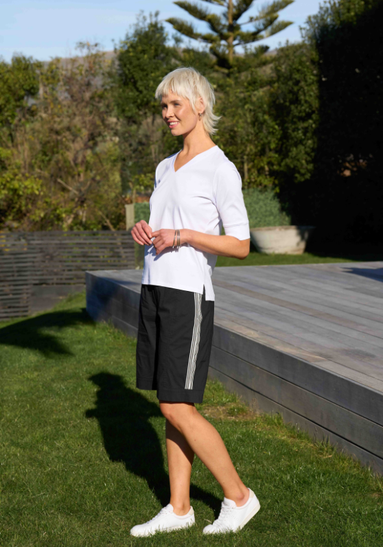 Slim leg shorts with a difference. In seam pockets for functionality and panel seams for a flattering look. Trim detail running down the side seam for a great look. Inner leg length is approx. 55cm (size 12)