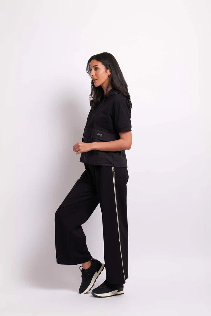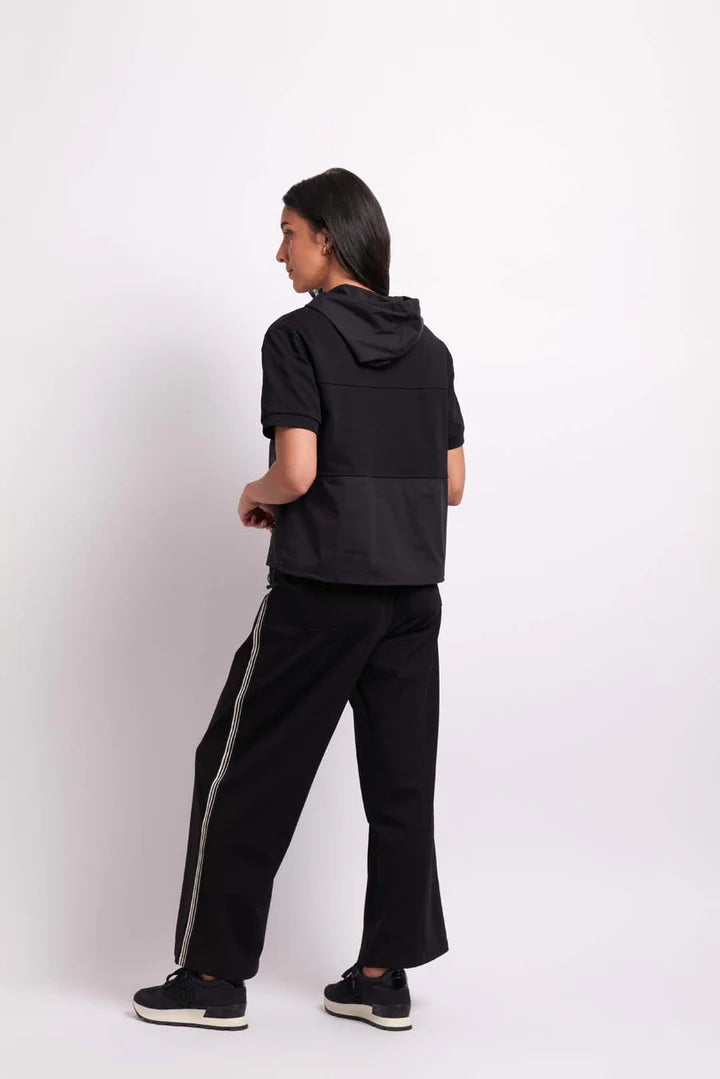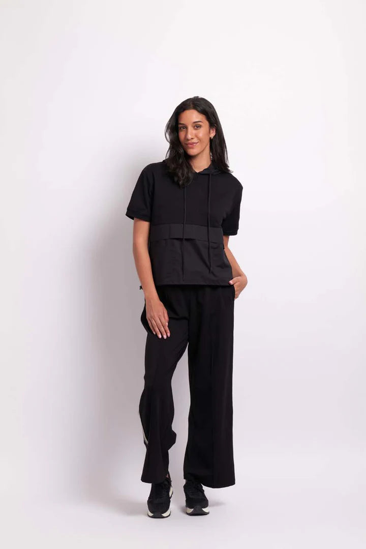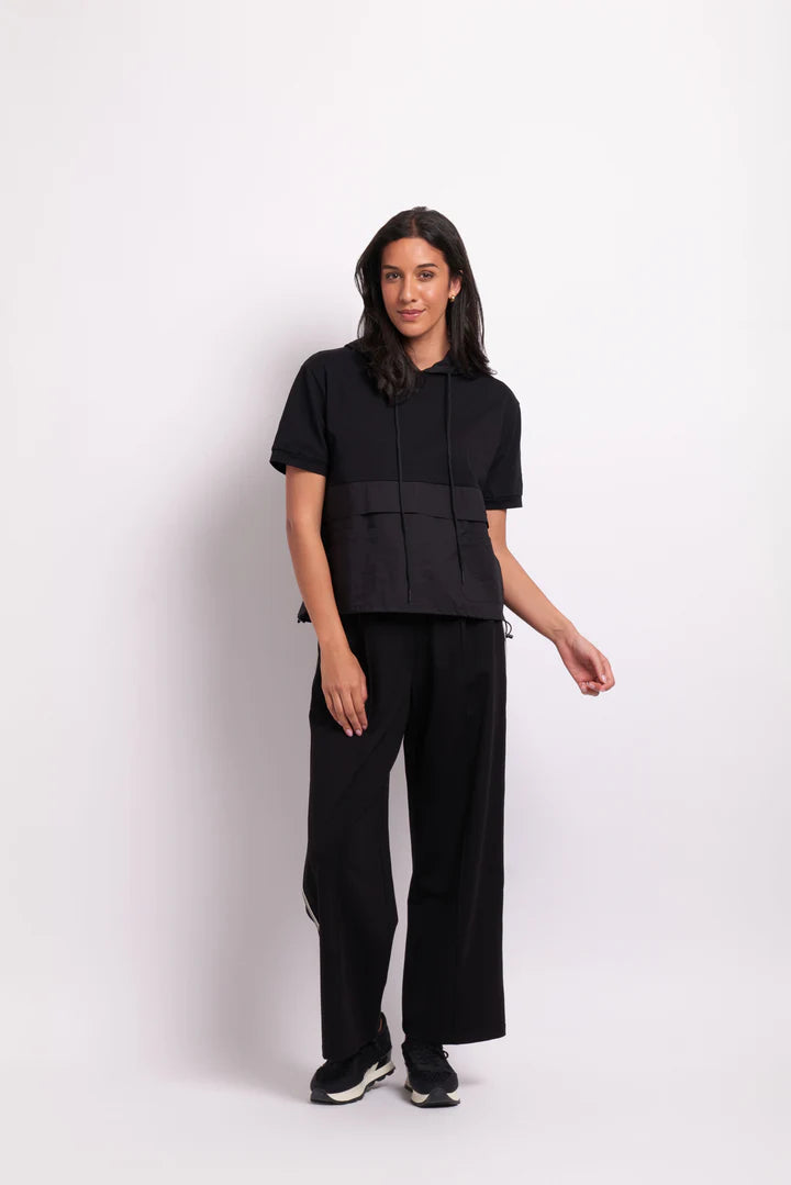 Short sleeve hoodie, contrast knit and woven fabrics, two front patch pockets