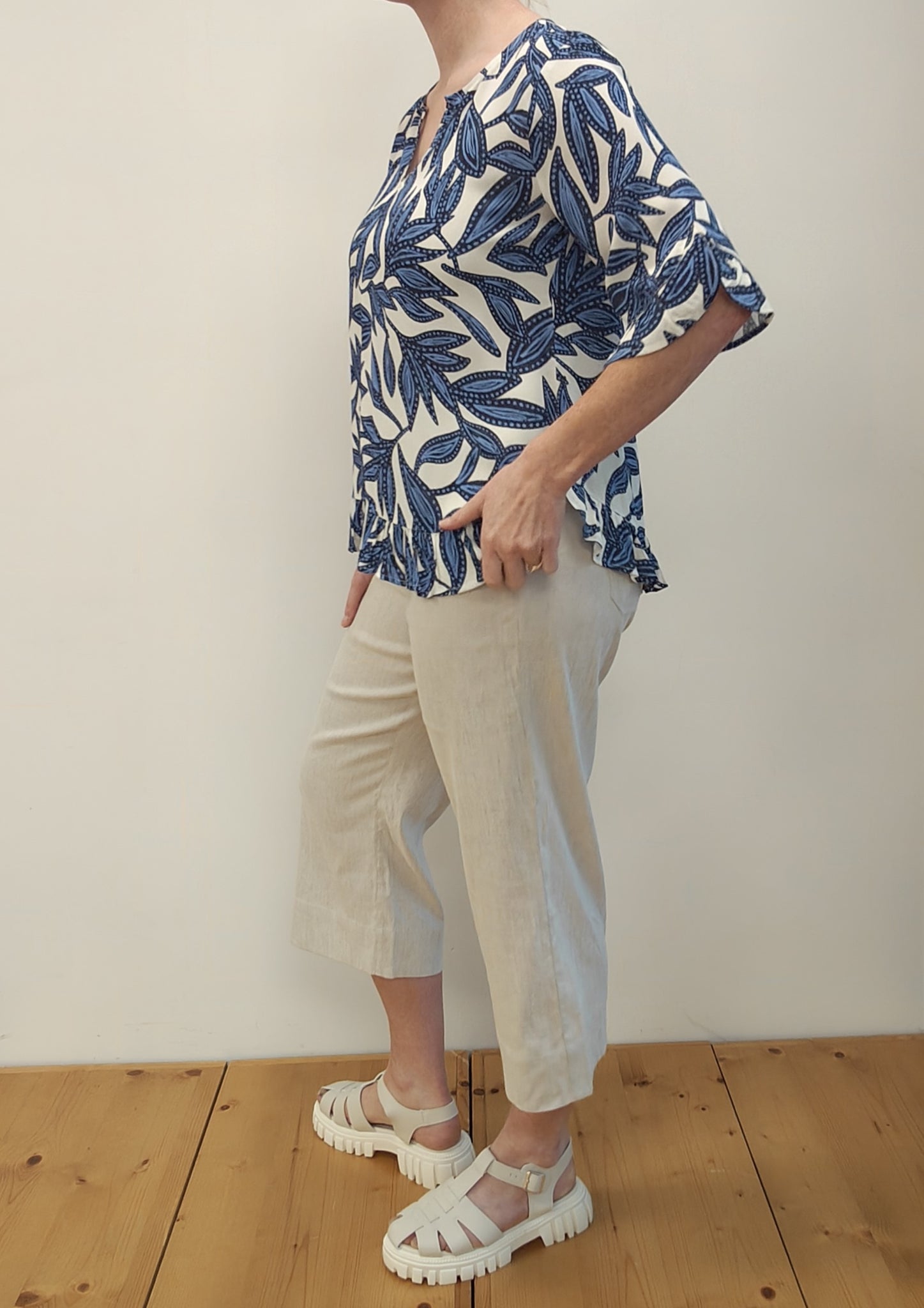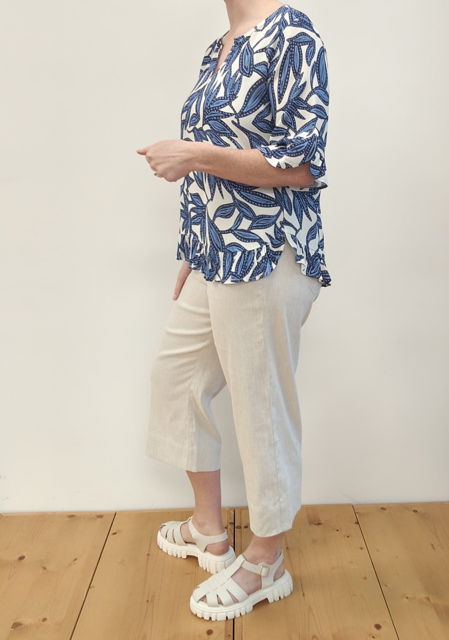 The perfect summer top to wear with your favourite jeans. Ruffles at the cuff and hem add a feminine touch. Keyhole front neck opening (with a hidden hook & eye) means you can wear this top as a scoop neck or V neck.