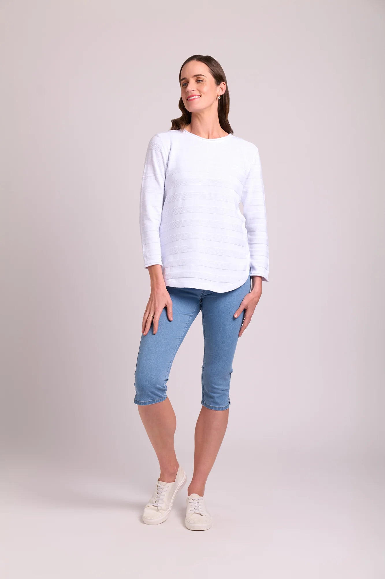 Striped jumper with scoop neck, full length sleeves & scoop hem.