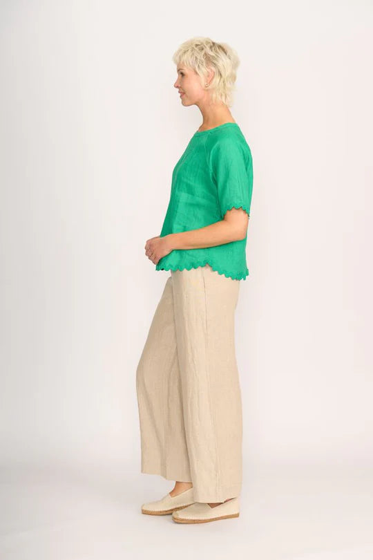 Ric-Rac edged top with a Summery boat neck. Featuring 3/4 raglan sleeves. Boxy fit. Body length from shoulder to hem is approx. 65.5cm (size 12).