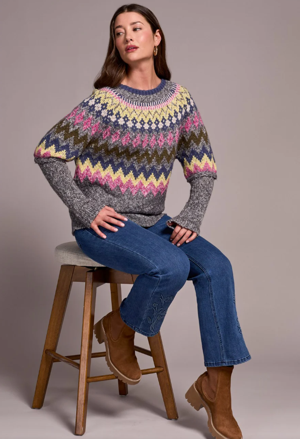 Step into the spotlight with this vibrantly patterned intarsia sweater, guaranteed to turn heads with its captivating multicolor design. Boasting a classic crew neckline, accentuated by raglan shoulder seams, and slightly puffed long sleeves with a ribbed texture from elbow to wrist, it's a statement piece that exudes both style and comfort.