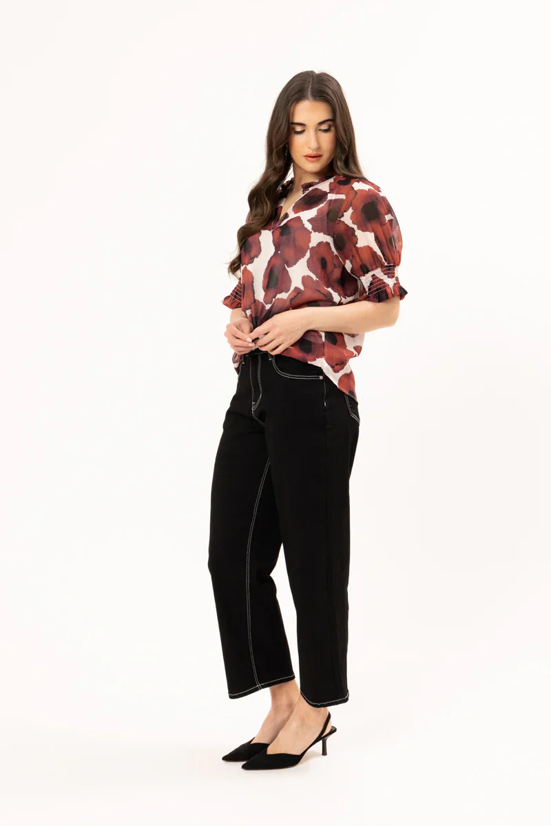 Designed with a relaxed silhouette and crafted from a lightweight fabric, this top offers both comfort and elegance.