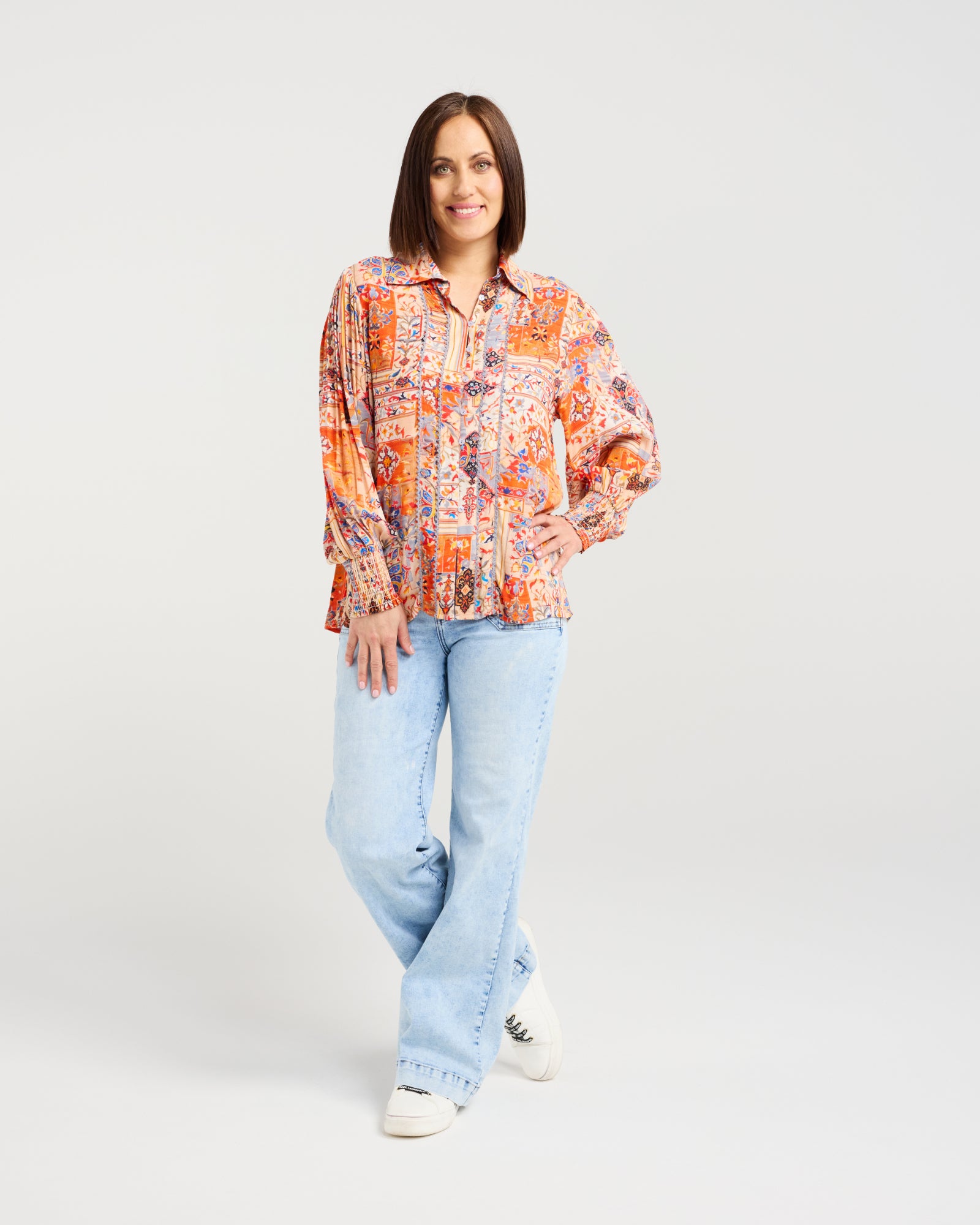 A classic button-down shirt refreshed with voluminous bishop sleeves and elasticated cuffs for an easy, comfortable fit. Trim detailing alongside the button panel adds a refined touch, while the colourful print brings a cheerful, modern feel to your look.