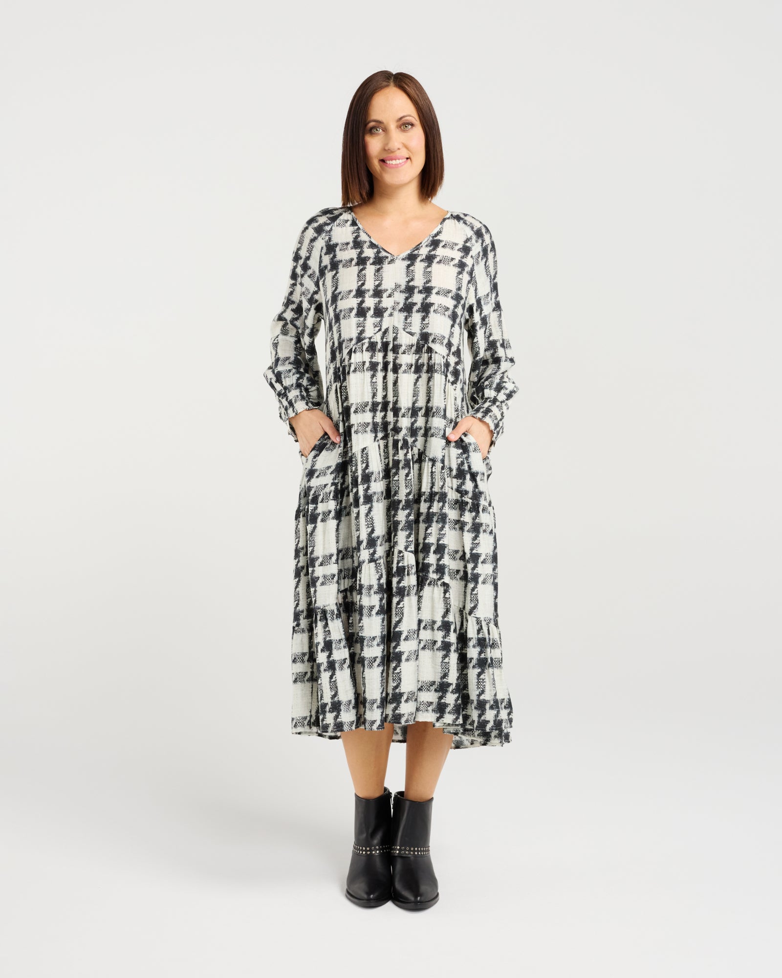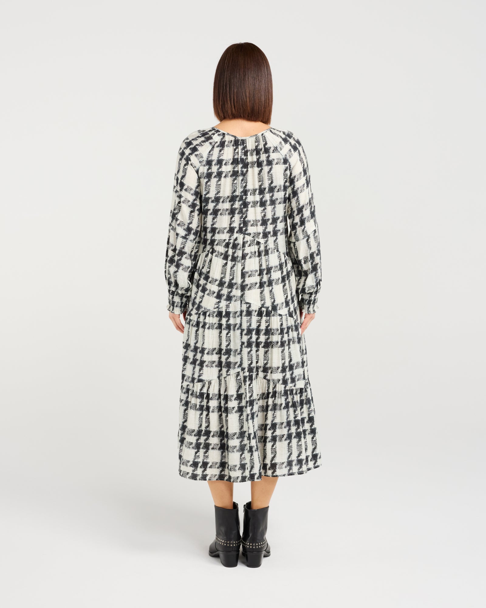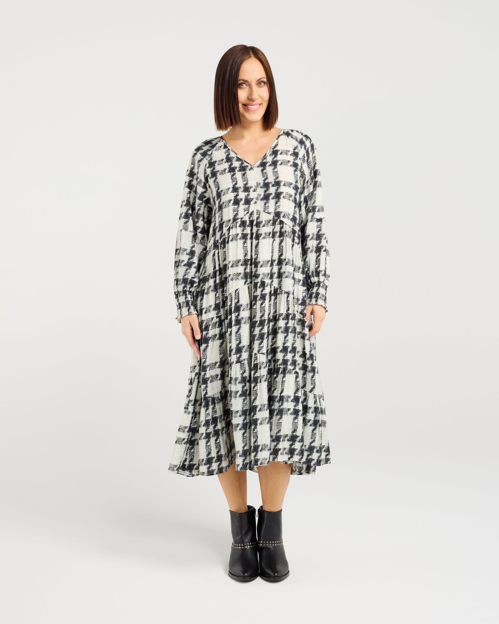 This long-sleeve dress offers a relaxed fit and a gently tiered skirt that moves with effortless grace. The soft V-neckline and flowy silhouette create a refined look that's comfortable yet polished. Falling below the knee, it's an easy winter staple with timeless charm.