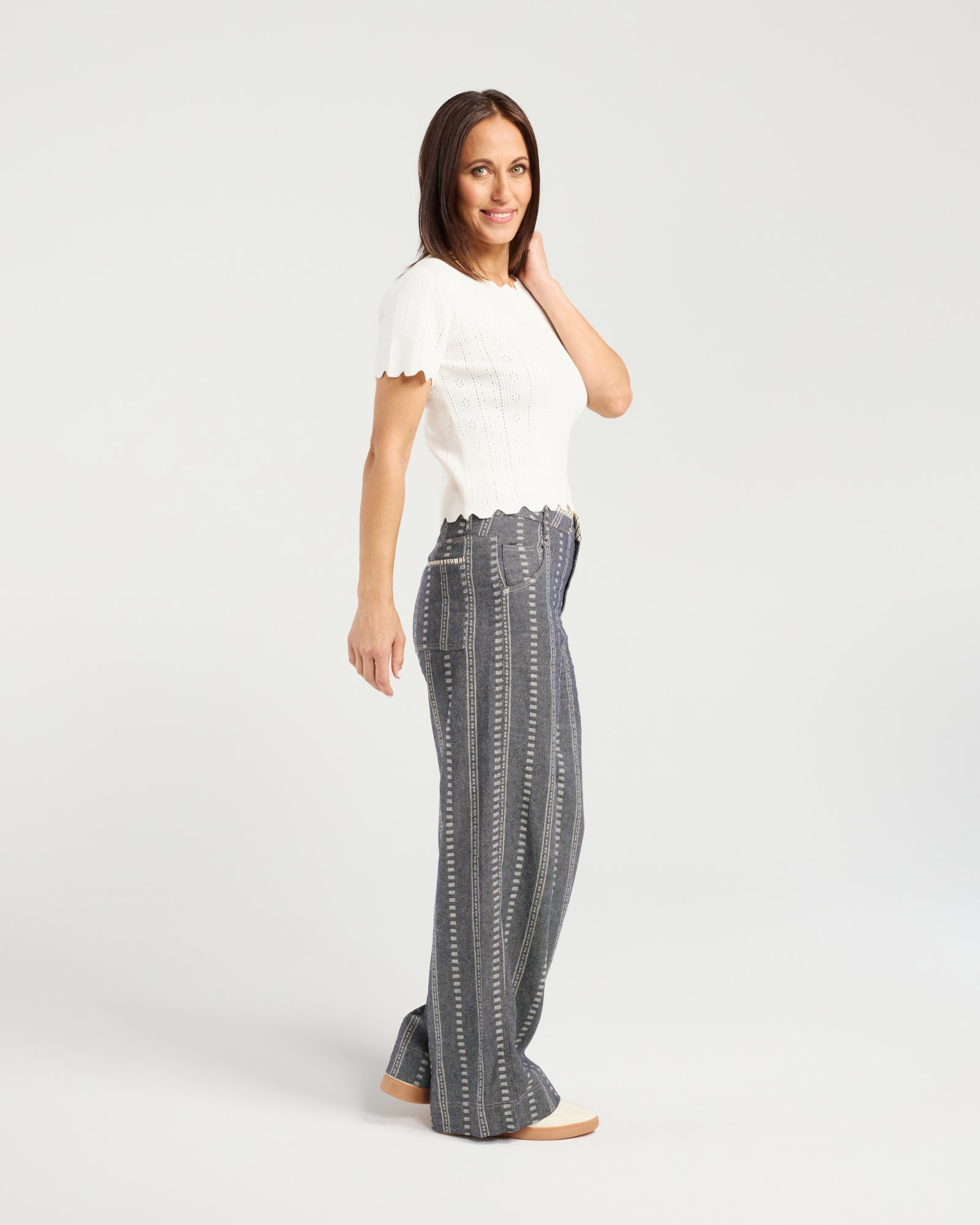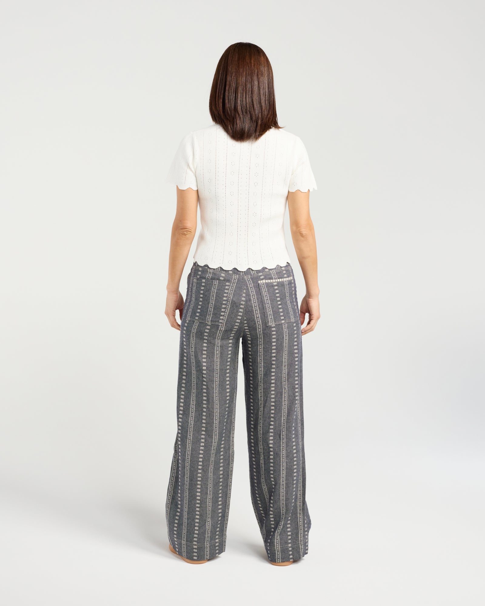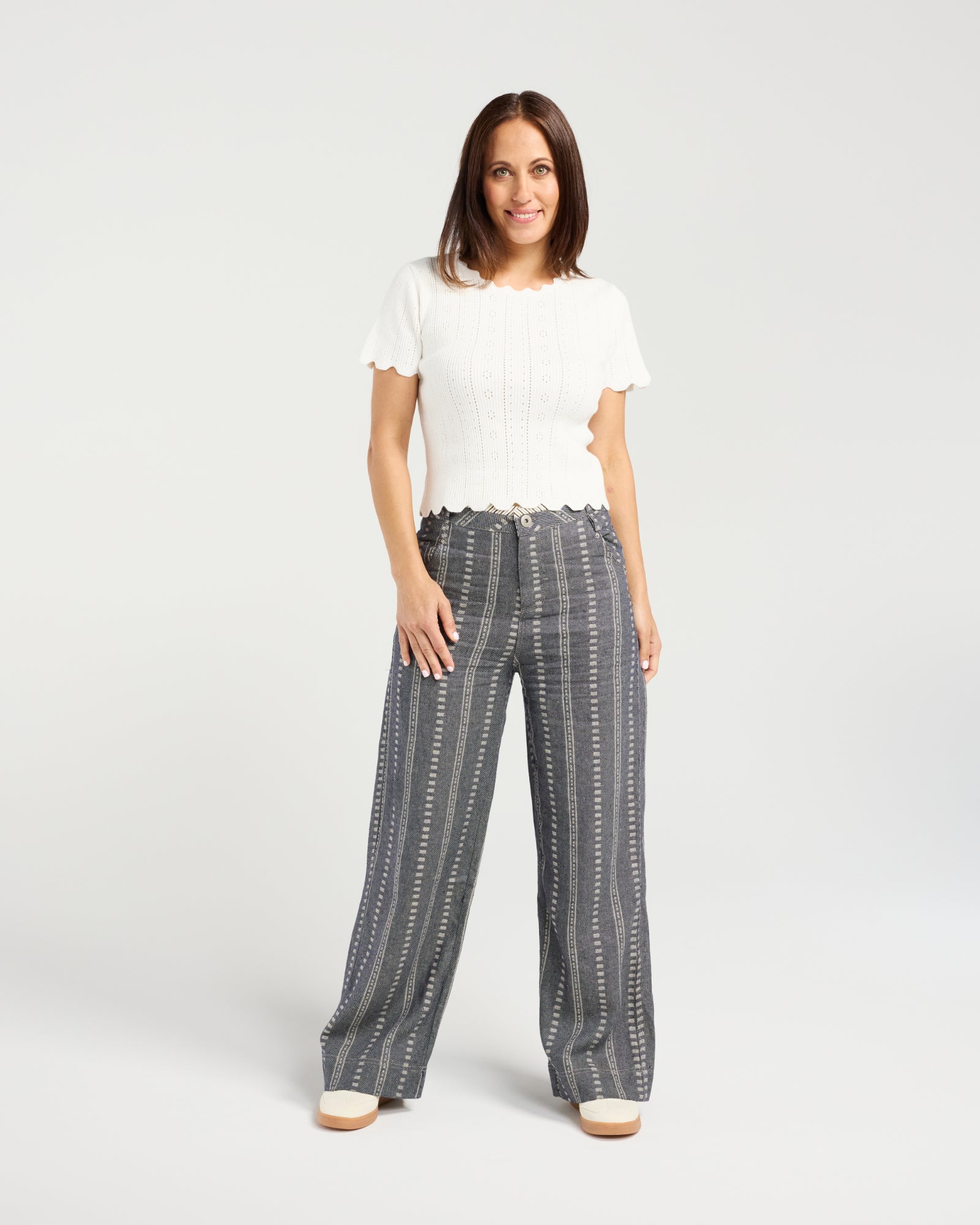 Sunmark: These cotton pants feature a modern, vertical stripe design for a sleek, elevated look. With a button closure and drawstring waist, they blend tailored style with comfortable, adjustable wear, perfect for effortless winter dressing.
