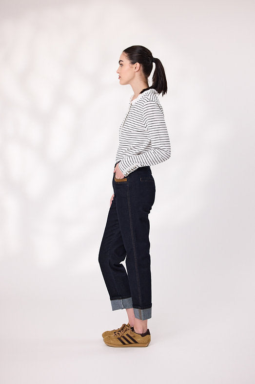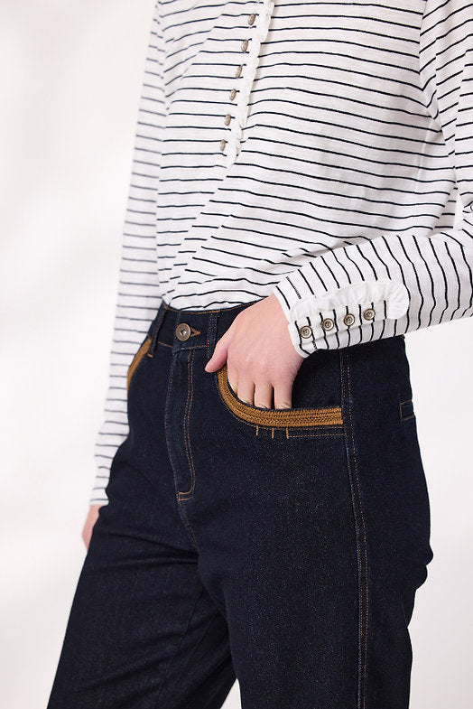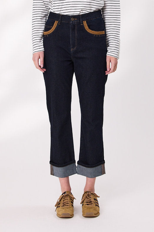 Crafted for comfort and style, this denim jean features a classic front fly zip paired with a flexible elasticated waistband for an easy, secure fit. Embroidery details at the pocket openings add a subtle touch of personality, while the tape accents at the hem—perfectly revealed when rolled—bring a modern, street-ready edge.
