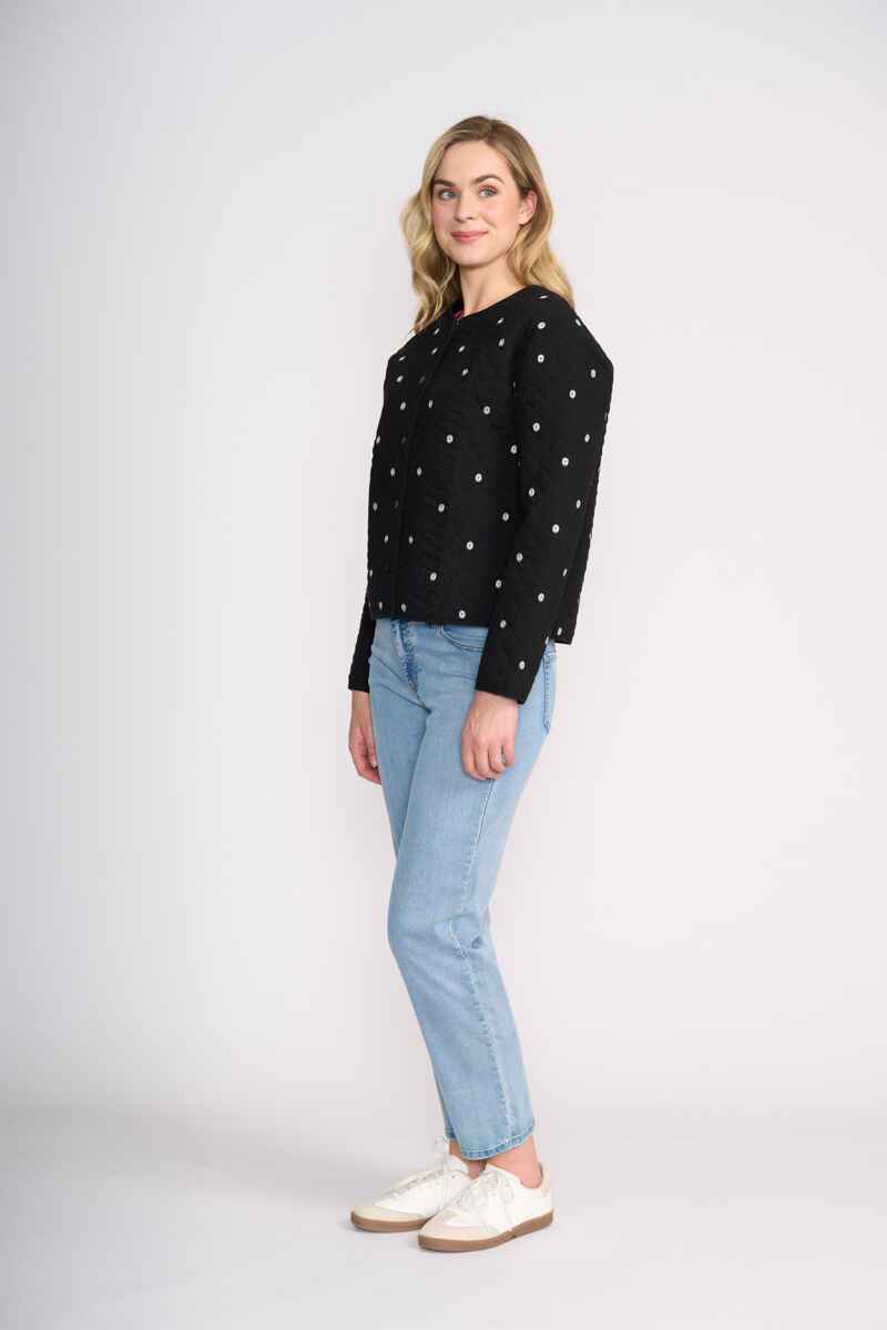 Wrap yourself in style with our quilted jacket, featuring a fun scattered embroidery. Enjoy comfort and convenience with full-length sleeves and two handy front pockets. The 60cm body length (size 10) ensures a flattering fit. Button up and enjoy effortless sophistication.