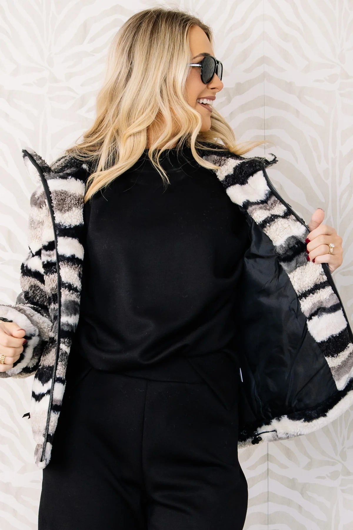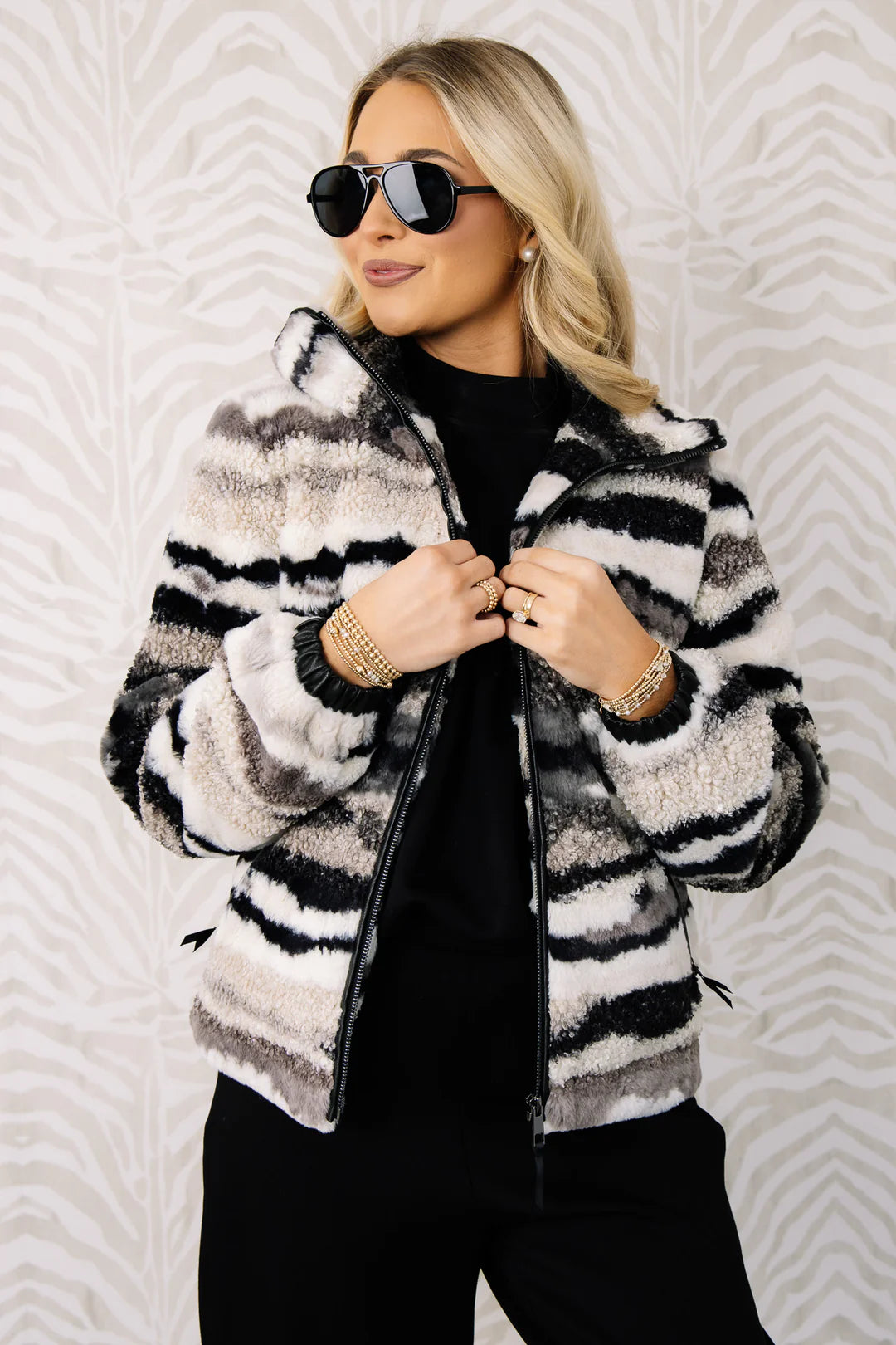 Cozy Nordic-inspired zip-up jacket with tribal lining, long sleeves, and waist-length cut. Perfect for layering.